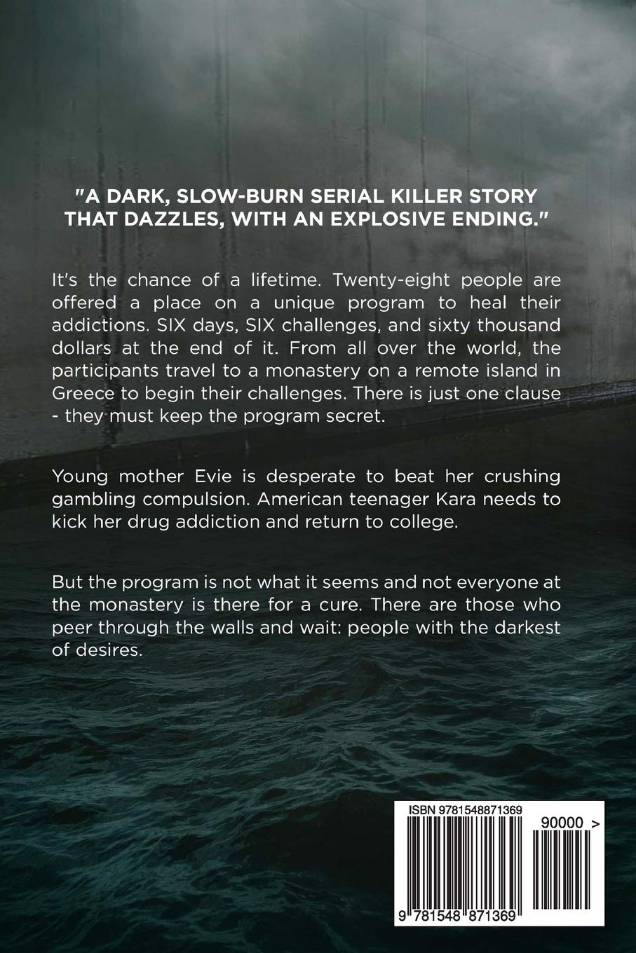 There are six days and six challenges on the path to healing. Ten thousand dollars per challenge. Sixty thousand on completion. Enough to pay off debts and start anew.Evie and 27 others from around the world travel to a monastery on a tiny Greek island to begin the program.